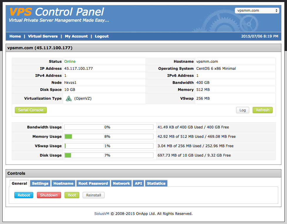 主要测试内容:一、控制面板,主要是最常用的solusvm面板,可以正常重装系统、重启,以及控制台等常见功能,这里就不多说了。二、常规测试,一个基础脚本,测试一下cpu、内存,以及一些常见网络下载。三、硬盘性能,因为采用提ssd硬盘,所以io读写非常给力。四、硬件测试,详细的cpu以及硬盘等相关参数。五、网络测试,来自阿里云北京、杭州以及美国节点的下载测试。