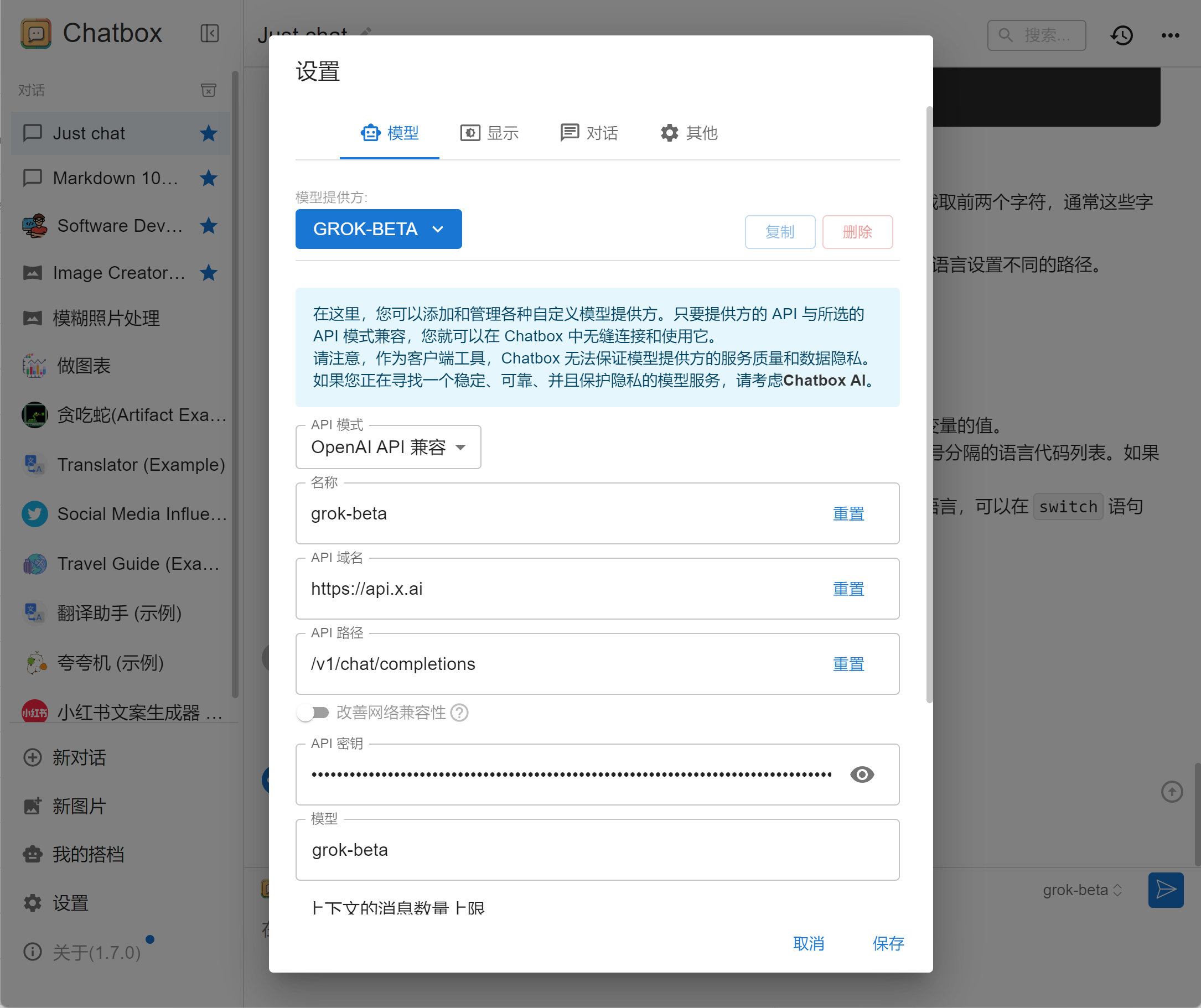 国内网络原因chatbox使用xai的api,需要科学上网来实现。